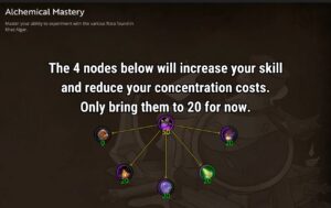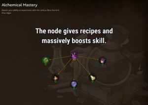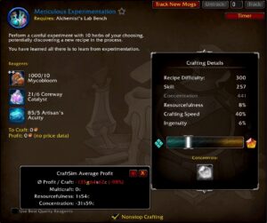 Since unlocking recipes is somewhat random, leveling alchemy will be different every time. Wild experimentation and meticulous experimentation (daily cooldown) is the mechanic to unlock recipes. When using wild experimentation, you may explode. When you explode, you’ll take some damage and you’ll have to wait 10 minutes to try to experiment again.