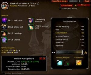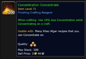 In addition to the gold made with concentration, you can make gold in 2 other ways. Patron orders can often lead to profit. Eventually, you won’t need your artisan acuity so you’ll be able to buy rank 3 material bags. On top of that, augment runes and finishing reagents can be obtained through patron orders. Those items can be used or simply sold on the auction house. As bonus value, your flask and phial durations are increased. This could be a great profession for your pvp and pve characters. You’ll also sometimes get free soulbound flasks and phials!