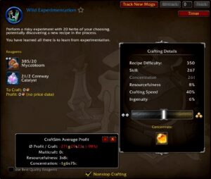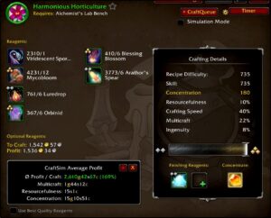 When crafting with alchemy, it’s important to understand how the quality of materials will affect your goldmaking. As we’ve seen before, skill is very important. The higher the quality of materials, the less concentration you’ll need to use as it will increase your skill! However, higher quality materials cost more gold which increases your crafting cost. So how can we figure out what are the best materials to use? Thankfully, craftsim is here for us once again. Using the advanced reagent optimization module, craftsim will tell you which quality of materials to use for your current craft! In the image below, you’ll see the difference between the normal reagent optimization (which focuses on average maximum profit per craft) versus the advanced reagent optimization (which focuses on average profit per point of concentration).