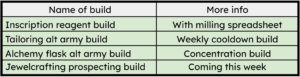 Enchanting and alchemy have great ways to achieve that. Tailoring also offers passive gold from the dawnweave and duskweave bolts. However, you need a really solid build to get decent profit with tailoring. If you are looking for builds for alt armies and reagent crafting, you can currently get 3 builds on my patreon! More builds will be coming each week!