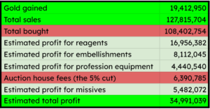 On top of that, I can’t really include my current crafts that are on the auction house. I would estimate them at around 5 million gold but it changes every hour from sales and purchases. I’ll try to keep each craft separated for better clarity.