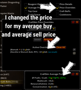 It was hard to calculate the exact profit. I looked at my average buy price and used the “price override” tool in the craftsim addon. I also entered my average sell price for reagents. I then checked the margins. For bismuth bolts, I had a 37% profit margin. I multiplied my total sales by 0.37 to see my profit. This is not precise. However, it gives a good idea of the potential from reagent crafting.
