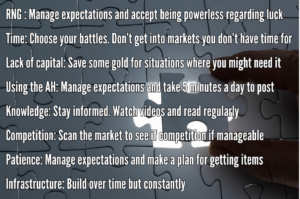 Using the auction house : Again, it comes down to managing expectations. If you’re hoping to get this 500 000 gold item to sell in a day, you might get disappointed. However, if you don’t expect sales, every time you sell an item is a nice surprise. Take 5 minutes a day to post your items!