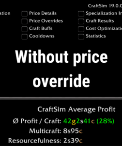 In the image below, you’ll see the difference in profit with and without the “real cost per pigment”. Without price override, where craftsim uses the auction house pigment price, the average profit is at 42g per craft. With price override, where craftsim uses your prices, the average profit is at 63 gold which is a massive difference. With maximum crafting speed (75%) and 63 average gold profit per craft, you would earn an average profit of 4342 gold per minute!