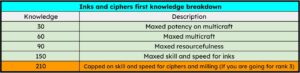 Skill doesn’t have too much of an impact on the build (except if you are going for rank 3). You’ll see that the first 60-90 points of knowledge spent gives 0 extra skill. The price between rank 1 and rank 2 reagents isn’t much different (except for codified greenwood). However, it’s amazing to be able to craft rank 2 inks with rank 1 pigments. Always use rank 1 pigments to craft inks (unless the rank 2 pigments are cheaper).